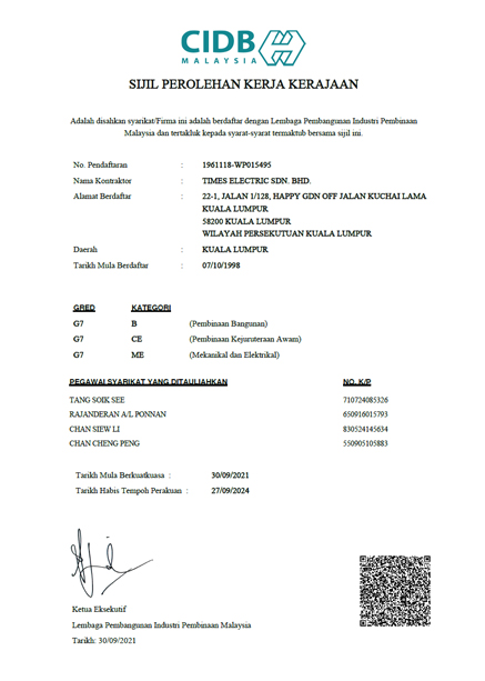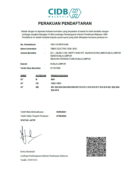 Perakuan Pendaftaran Sebagai Kontraktor Elektrik TM Supervision of RT Civil Work Course Perakuan Pendaftaran CIDB Perakuan Pendaftaran SPKK Suruhanjaya Syarikat Malaysia (Form 13) A Suruhanjaya Syarikat Malaysia (Form 13) B Electrical and Electronics Assiciation of Malaysia ISO 9001:2015 Provision of Electrical Engineering, Telephone and ELV Services